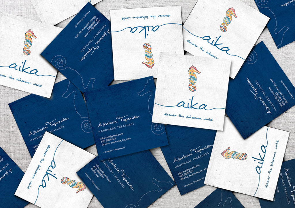 The aim of this brand was to establish new visual identity defined by elegance, mildness, and a joyful attitude. Aikaterini ’s love for nature and specially for the sea world gave her the main inspiration for this project. Hence, the colour palette is composed by mostly blue and white shades and the choice of the seahorse was not at all accidental ( as you will find out further down).
