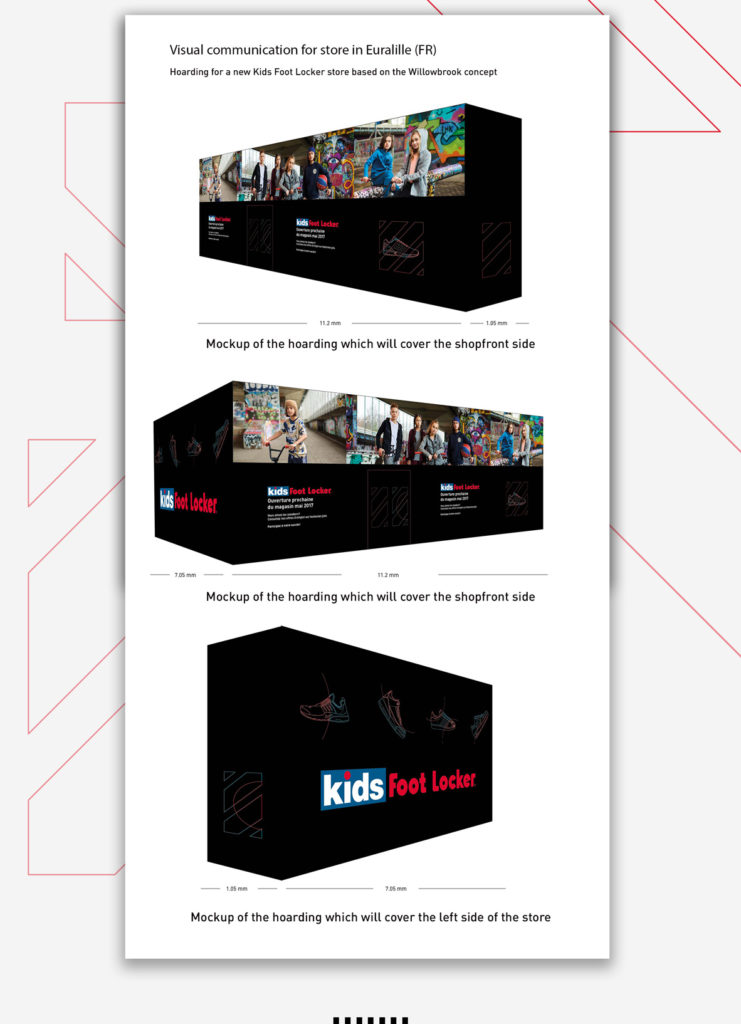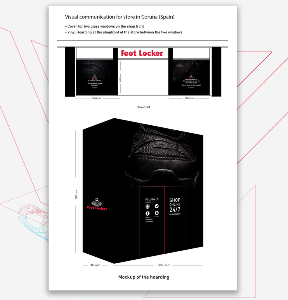 In the images below you can see some presentations of hoardings (advertising boards) which are placed in front of the Foot Locker stores around Europe, in order to to protect the public from site works and promote the opening dates of the new stores.